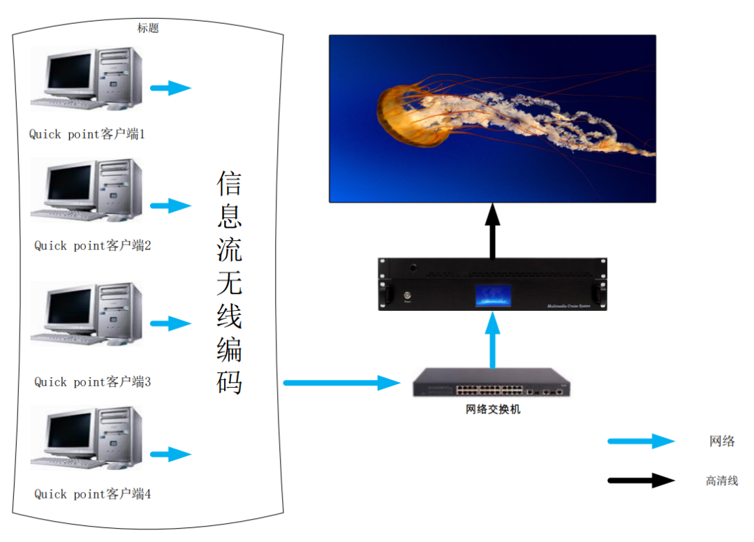 Quick Point網(wǎng)絡(luò)迅屏軟件安裝在需要上墻顯示的PC上作為服務(wù)器端,通過IP網(wǎng)絡(luò)與大屏幕系統(tǒng)的MCS云播控平臺及控制軟件MCWall連接,需要上墻顯示的各種PC應(yīng)用服務(wù)通過在MCS云播控平臺的MCWall軟件開窗,Quick Point將PC上的應(yīng)用窗口轉(zhuǎn)為視頻輸出,對其實時編碼(H264),并通過IP網(wǎng)絡(luò)傳輸?shù)酱笃聊簧巷@示。